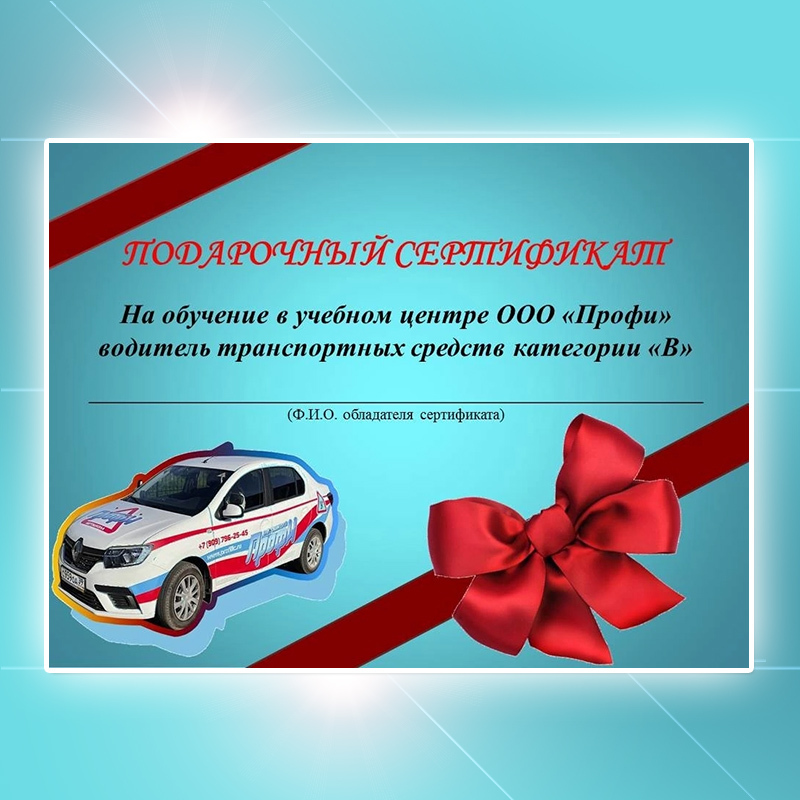 Учебный центр "Профи" в Калининграде и Полесске предлагает подарочные сертификаты на наши учебные курсы: в автошколе, в мотошколе, на курсы трактористов и другой спецтехники. Подарочный сертификат - это возможность сделать замечательный подарок.